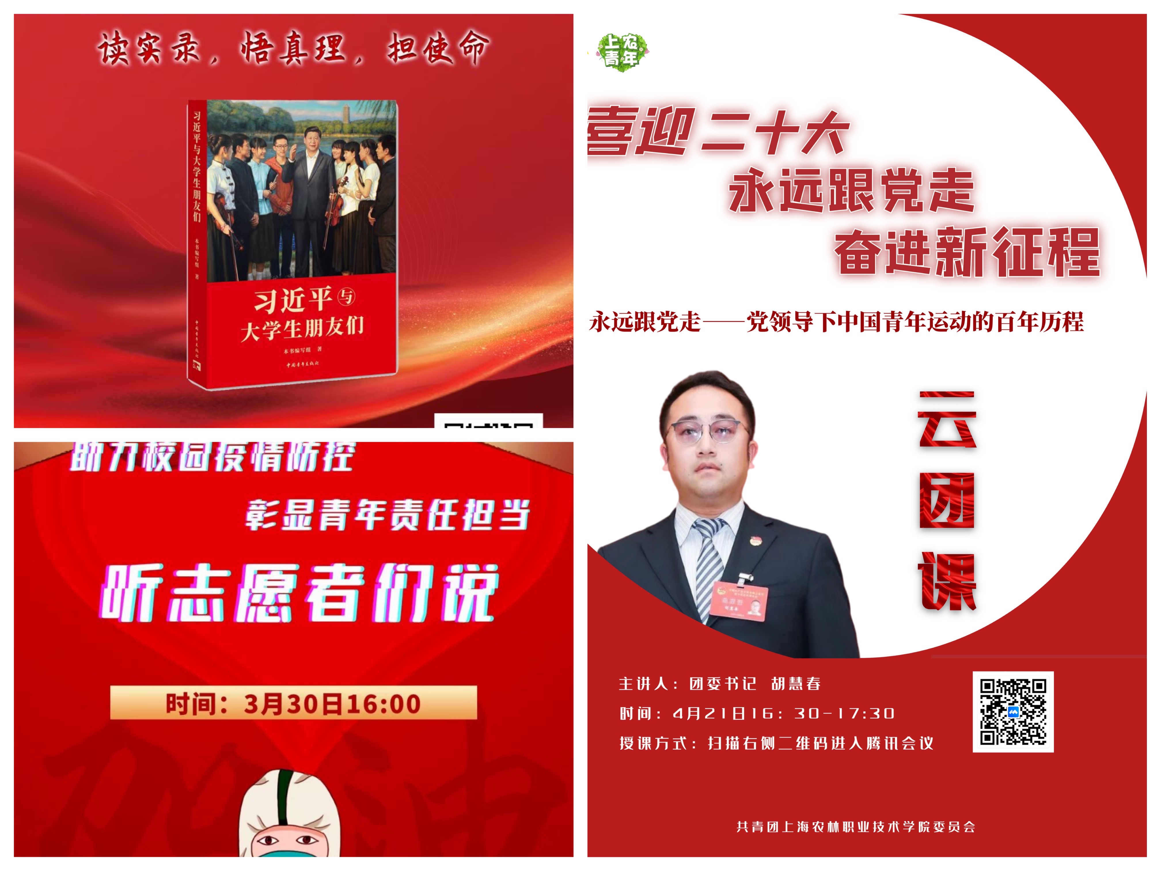 3月-4月,院团委组织全院团支部围绕“德、智、体、美、劳”五育并举开展“校园抗疫情,上农青年在行动”“喜迎二十大、永远跟党走、奋进新征程”等线上主题系列活动,把同心抗疫、奋勇向前作为推进学生思想政治引领的重要实践,坚定上农青年战“疫”必胜信心。开展战疫云团课8期,把握疫情防控中的教育契机为青年学生注入“精神疫苗”;上农青年讲师团开展线上宣讲3次,加强正面引导、正向激励;各基层团支部开展主题云团日活动260余场,通过交流分享志愿心得,宣传推广防疫知识,线上学习伟大抗疫精神等,持续凝聚青年学生抗疫青春力量。