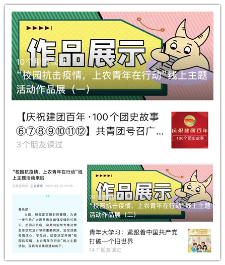 面对严峻的疫情防控形势,院团委及时传达团市委、学院党委有关防疫工作会议精神,第一时间向全院团员青年发布《致上农青年的一封信》《致全体上农青年倡议书》《战“疫”终将必胜—致各级团组织和广大团学骨干的动员令》等内容,发挥团组织战斗堡垒作用,强化团学骨干示范作用。