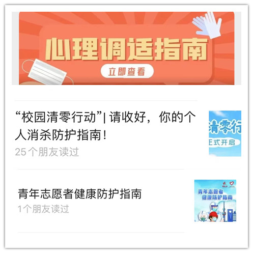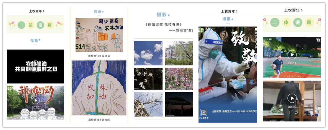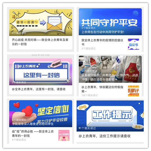 “上农青年”微信平台定期推送青年志愿者健康防护指南、个人消杀防护指南、核酸检查自我防护要点等内容,加强疫情防控教育,普及防疫知识,引导学生不信谣、不传谣、不造谣,为打赢疫情防控阻击战营造良好氛围。