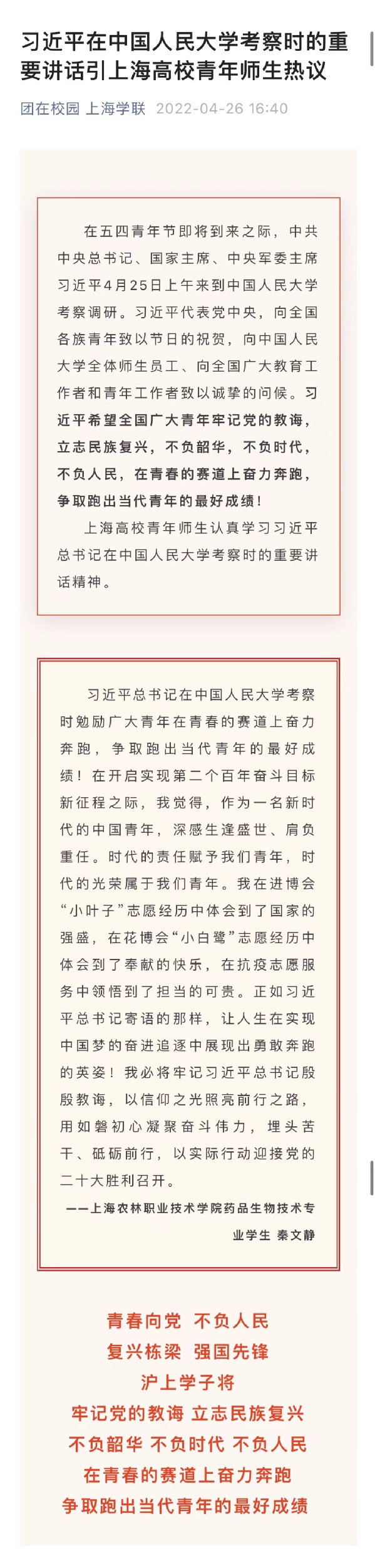 4月26日,上海学联微信公众号报道学院学生热议习近平总书记在中国人民大学考察时的重要讲话,全文如下: