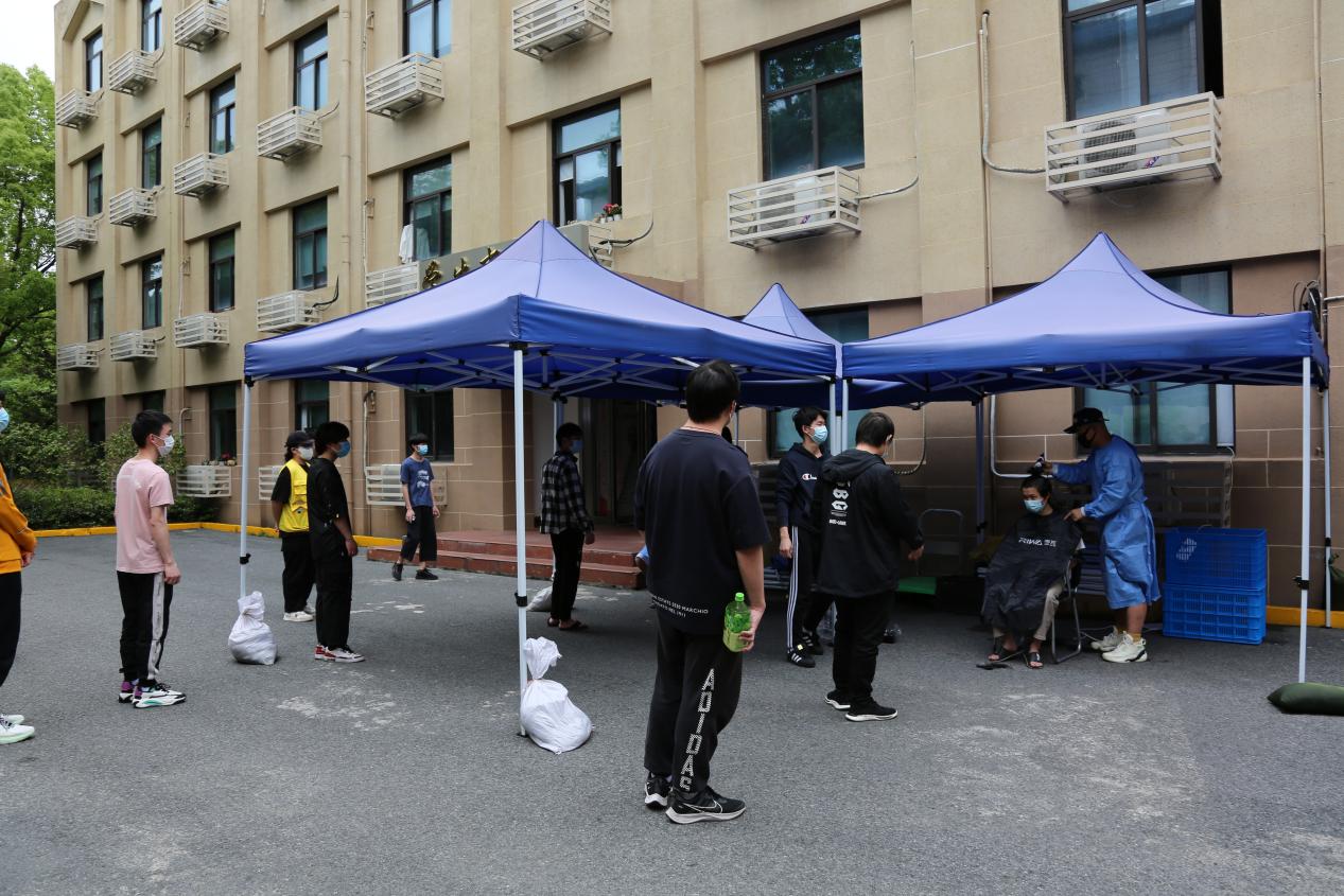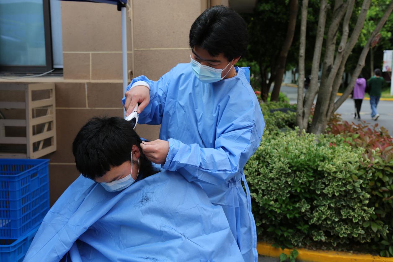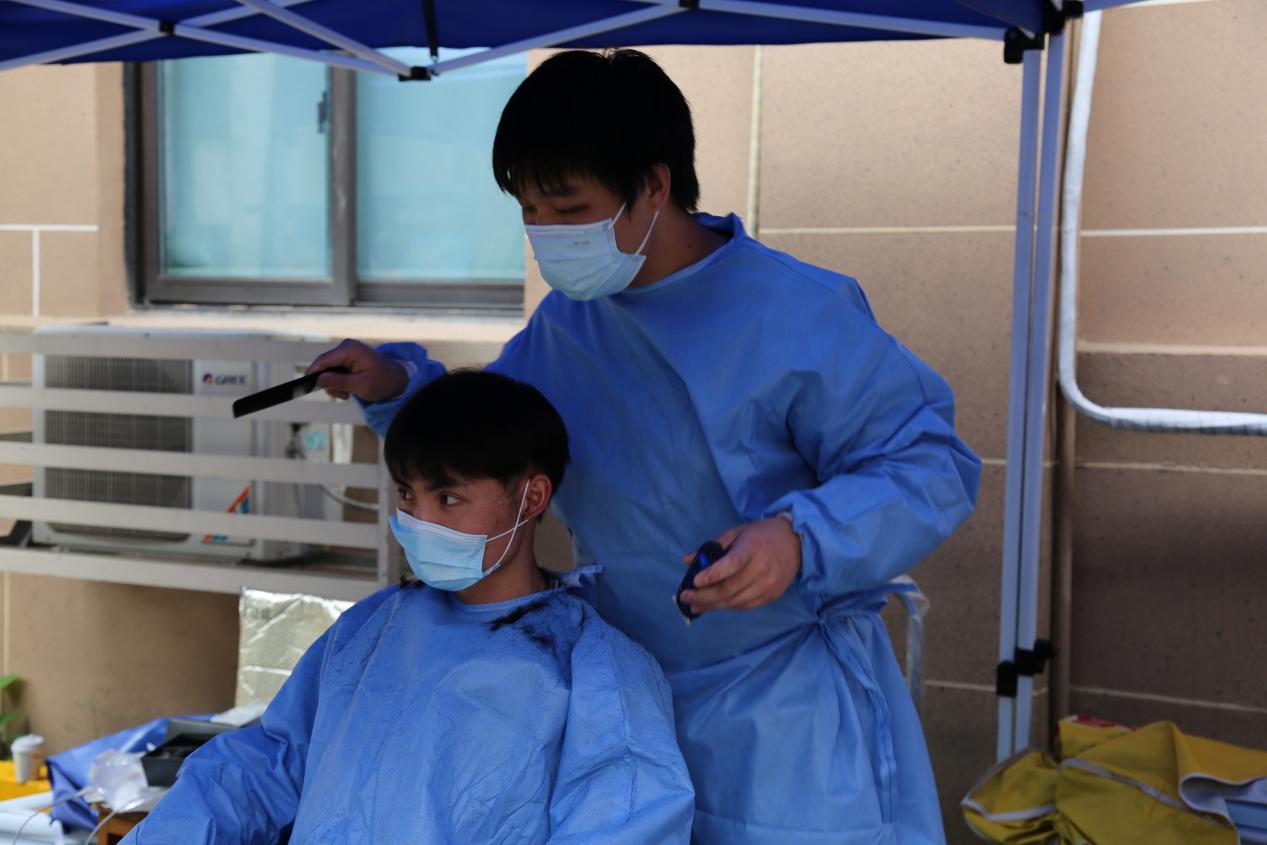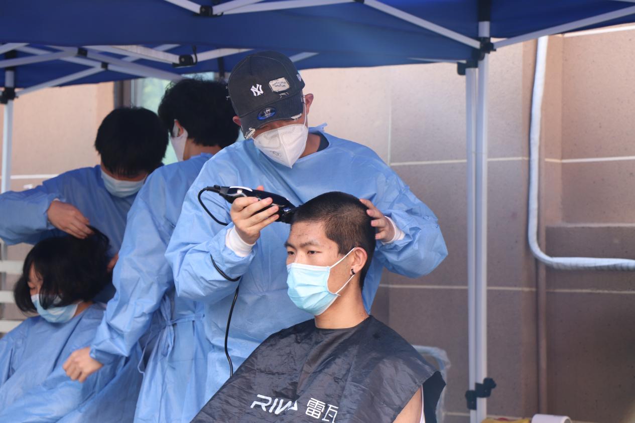 一把平剪、一只梳子、一个电推剪,隔离衣充当围布,就这样搭起了一个简易“理发店”。“理发店”里,“Tony老师们”佩戴口罩,穿上隔离衣,并对理发工具进行酒精消毒,在“工位”上忙得热火朝天。现场看来,他们的动作可以说是非常娴熟了,一套行云流水的架势打造了一批“板寸头”生产线。有不少同学笑着说,看来今天是全校男生们统一发型的一天。这也让几位“兵哥哥”想起了那段在军营里自己理发的日子,能够“重操技能”,为大家做一次特殊的服务他们都觉得很有意义。