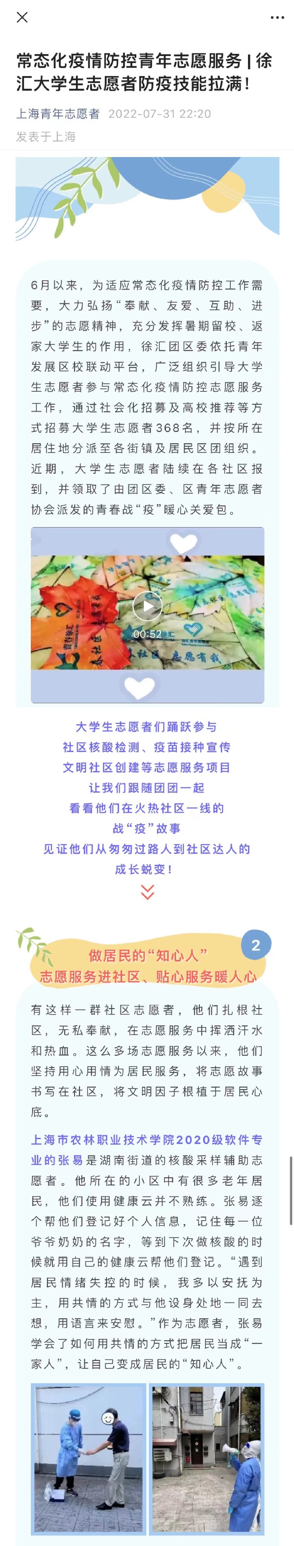 7月31日,“上海青年志愿者”微信公众号报道学院学生参与社区疫情防控事迹。报道全文如下: