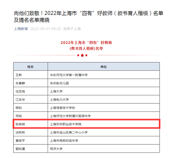 上海市教委公布了2022年上海市“四有”好教师(教书育人楷模)名单,学院张微微老师经基层推荐、专家遴选和组织审定,获评2022年上海市“四有”好教师(教书育人楷模),这是学院教师首次获得上海市“四有”好教师(教书育人楷模)荣誉称号。