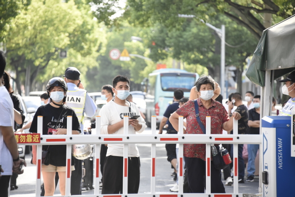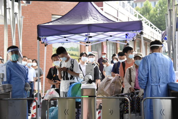 新生按照防疫要求,有序排队进校