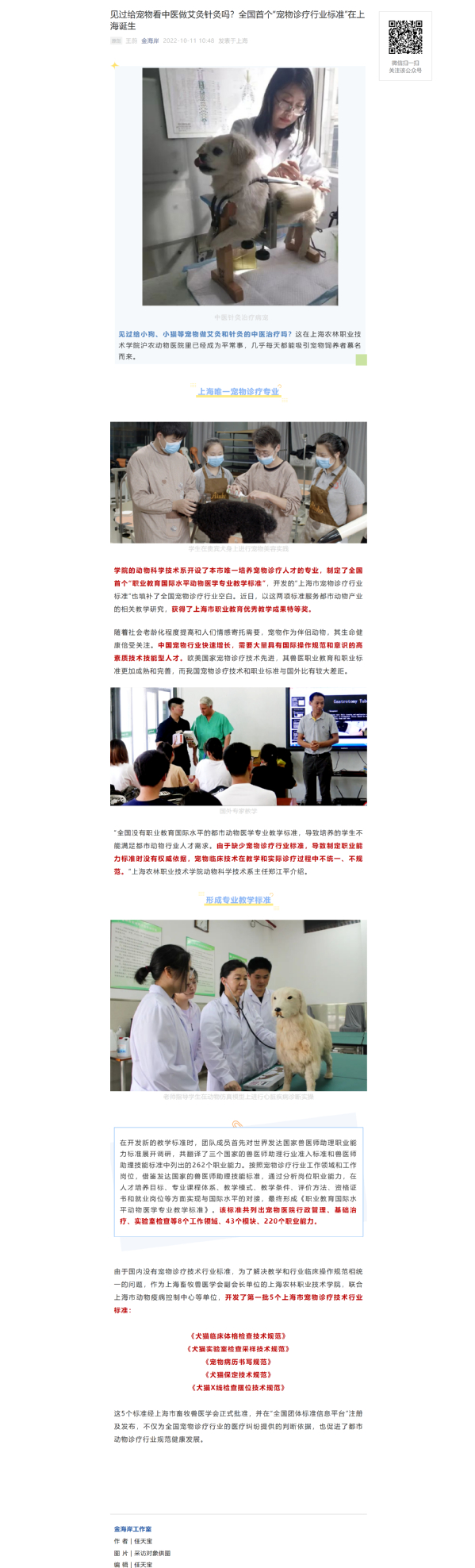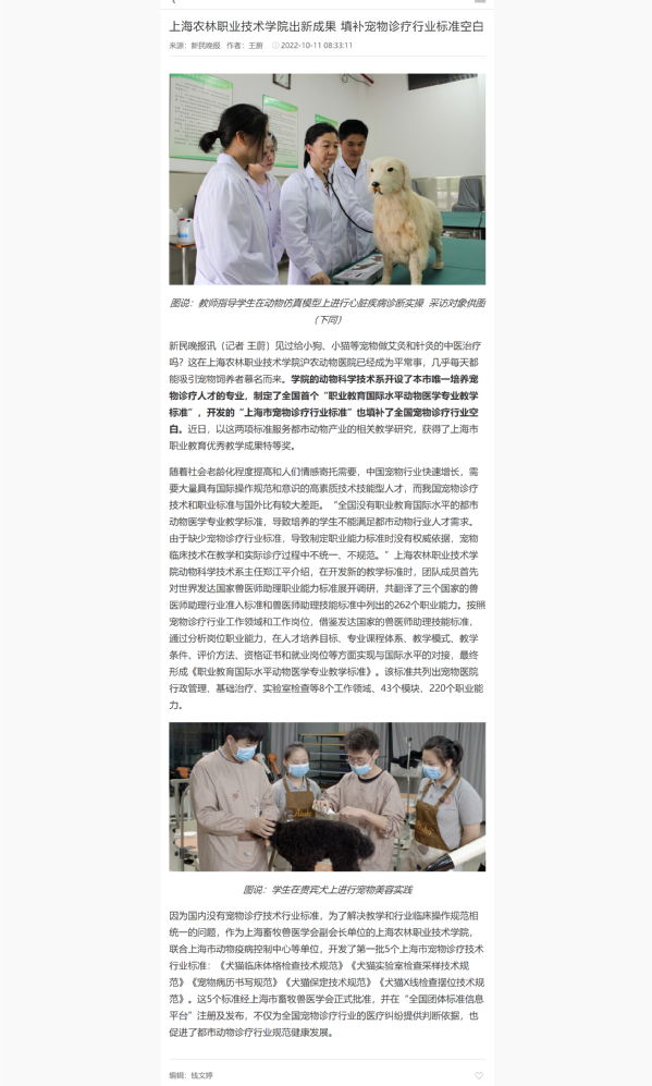 新民晚报:上海农林职业技术学院出新成果 填补宠物诊疗行业标准空白