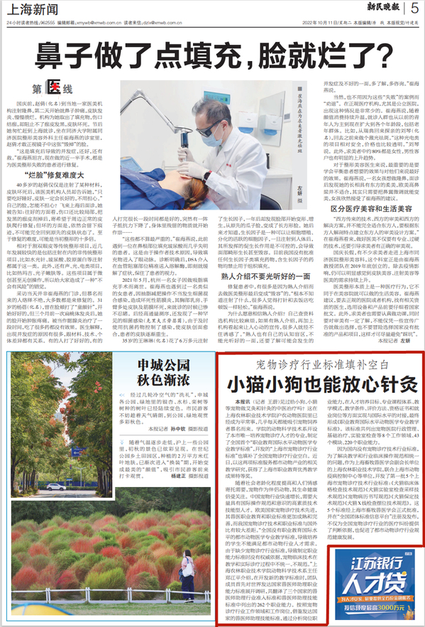 新民晚报报纸:宠物诊疗行业标准填补空白 小猫小狗也能放心针灸