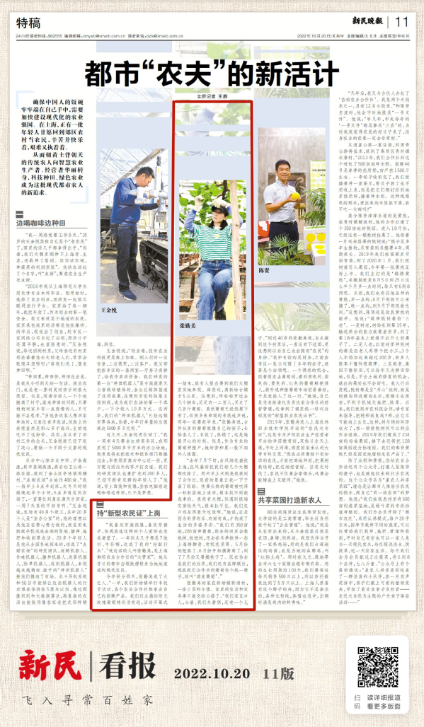 10月20日,新民晚报报纸、客户端以“都市‘农夫’的新活计”为题,以“特稿”方式报道了学院2019级“农民大专班”毕业生张勤美回到郊区经营农业合作社,成为一名持“新型农民证”上岗的现代农民,投身乡村建设,为乡村振兴贡献力量。一起来看看张勤美是如何从一名都市白领到职业农民的故事吧。