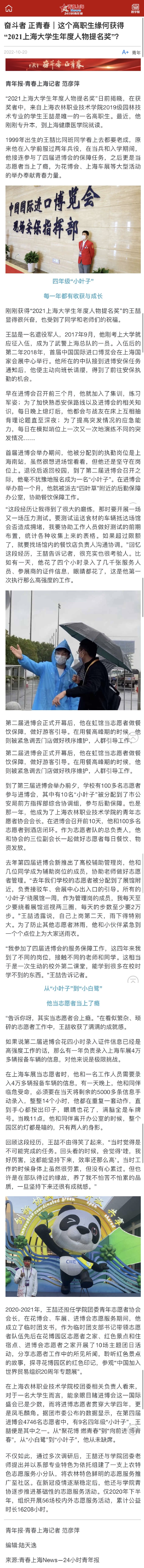 10月20日,青春上海news——24小时青年报报道了“2021上海大学生年度人物提名奖”获得者、进博会四年级“小叶子”、2019级园林技术专业学生王喆志愿服务事迹。一起来看看王喆同学的风采吧。