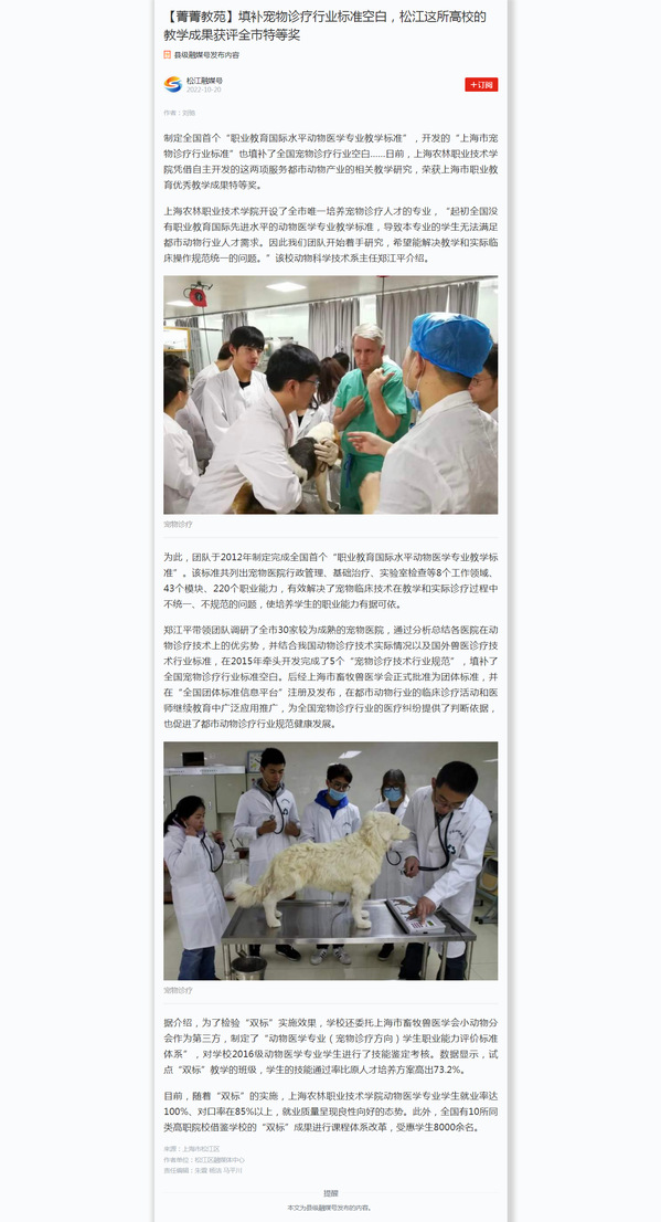10月20日,“学习强国”学习平台报道了学院凭借自主开发的“职业教育国际水平动物医学专业教学标准”和“上海市宠物诊疗行业标准”这两项服务都市动物产业的相关教学研究,荣获上海市职业教育优秀教学成果特等奖。