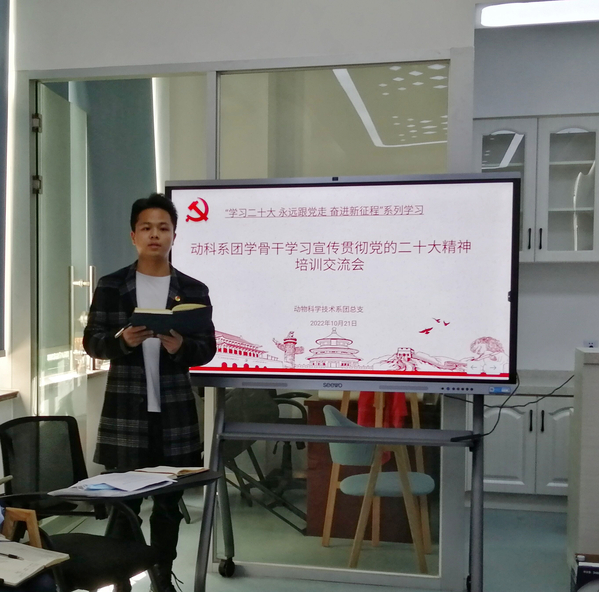在交流分享环节,动科系团总支副书记王云表示,祖国的这十年正是我小学、初中、高中三个重要学习阶段经历的十年。这十年来,我看着我居住的小镇修出了更多的水泥路,学校的教学设施更加高级,村村通的小巴士将人间的幸福笑语传播开来。我们有了更好的学习环境和生活环境,这一切的获得都是中国共产党的不懈努力为我们创造的。我必将努力学习,认真钻研知识,定下阶段目标,时刻鞭策自己,牢记所肩负的责任与义务。学生会负责人何卓钊表示,党的二十大报告鼓舞人心、催人奋进,作为一名团学干部,我更加应该去增强我的责任意识,这样才能在关键时刻和危急关头豁得出去、顶得上去、经得住考验,要始终保持创先争优的心态,把工作的标准、热情、状态和劲头都调整到最大。学生会副负责人岳雯表示,作为新时代的青年,我们要用更高的标准严格要求自己。学习好自己的专业知识,提高自己的综合能力, 将个人理想追求融入党和国家的事业中。