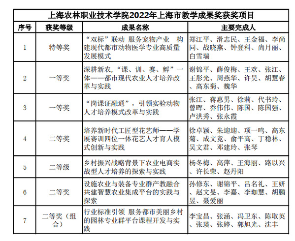 近日,上海市教委发布了《上海市教育委员会关于公布2022年上海市优秀教学成果名单的通知》(沪教委人〔2022〕33号),学院喜获7项上海市教学成果奖,其中特等奖1项、一等奖2项、二等奖4项。由郑江平老师主持的《“双标”联动 服务宠物产业 构建现代都市动物医学专业高质量发展模式》获得特等奖,这也是学院首次获得上海市教学成果特等奖。此次获奖数量及获奖等级均取得历年来最好成绩,显示了学院在教育教学改革方面取得的突出成就。