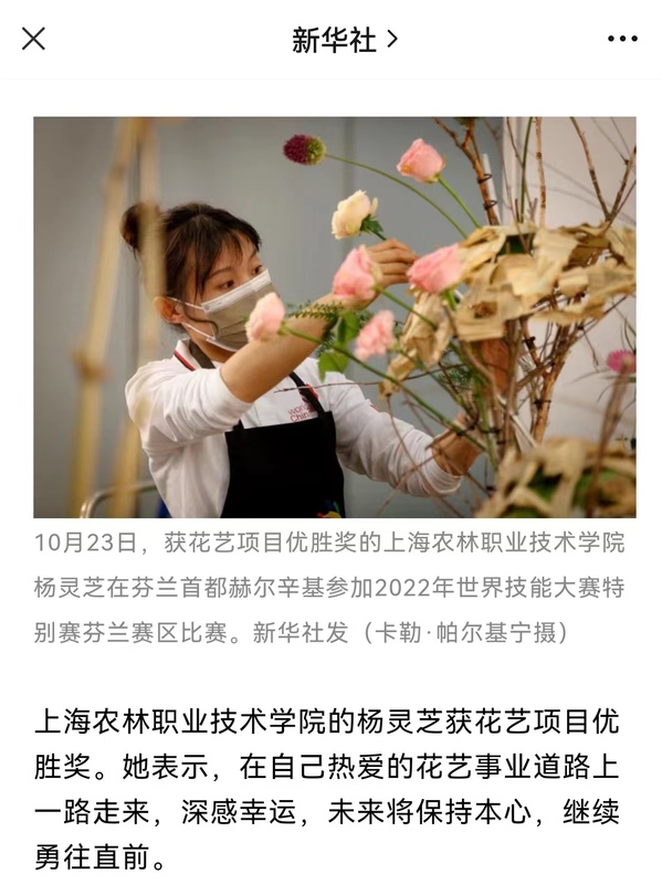 10月28日,“新华社”公众号报道了杨灵芝在2022年世界技能大赛特别赛芬兰赛区借实力在国际舞台上释放技能之美,展现中国年轻一代务实肯干、精雕细琢的工匠精神。
