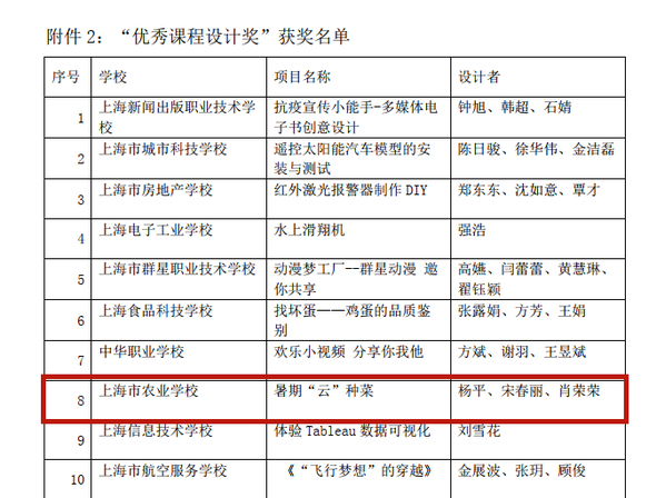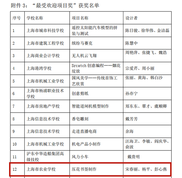 根据2022年上海市学生职业体验日活动组委会的奖项评选结果公示,由实训基地教师设计的“压花书签制作”、“暑期‘云’种菜”两个体验项目分别获得“最受欢迎项目奖”、“优秀课程设计奖。”