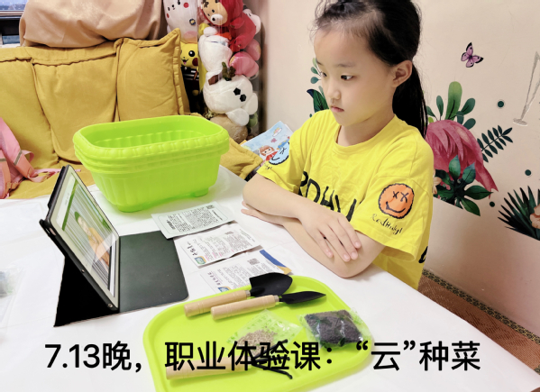 暑期“云”种菜让同学们学种菜不用等到课堂,在家按照蔬菜生长特性进行蔬菜品种选择与种植,指导老师通过微信交流群进行线上技术指导,同学们以照片、视频、观察日记、体验小结等形式全程记录他们“云”种菜的过程。项目全程引导学生崇尚劳动、尊重劳动,让学生从小养成良好的劳动习惯,掌握运用动手技能解决生活中实际问题。