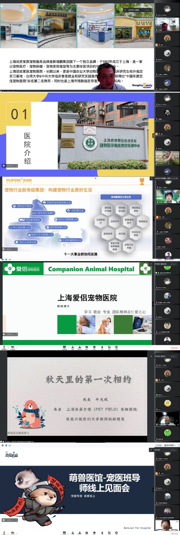 10月29日、30日,动科系召开“未来宠医卓越班”导师线上见面会,特邀上海顽皮家族宠物医院、上海农林职业技术学院宠物医院、上海瑞鹏宠物医院有限公司、上海爱侣宠物医院、派菲尔德宠物医院、上海贝康宠物医院等企业开展专题讲座。动科系辅导员、34名动物医学专业和宠物医疗技术专业学生参加会议。动科系副主任滑志民主持会议。