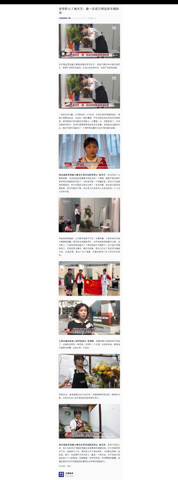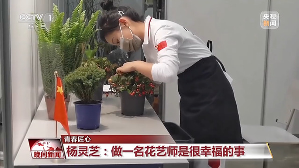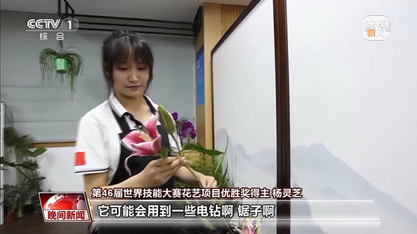 第46届世界技能大赛花艺项目优胜奖得主 杨灵芝:在学习花艺之前,我认为的花艺可能就是像花店里面那种插插花泥、打打花束那样的工作,但是学习之后,我发现它并不是这样的,它可能会用到一些电钻、锯子,包括劈竹子的大砍刀,算是一个体力活,对于女孩子来说也是个不小的挑战。我觉得做一名花艺师是一件很幸福的事情,是通过我的双手和花把美好的事物以及幸福传递给别人。