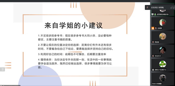 近两年受疫情影响,就业形势严峻,越来越多的学生选择升学路径,但苦于对全日制专升本的相关信息知之甚少,错失良机。与此同时,部分新生现阶段存在缺乏目标性和自律性等问题,急需给予正确的生涯指导。经管系特邀往届优秀毕业生在线分享自己的大学生涯及专升本备考历程,与新生展开经验交流与互动,助力新生科学规划大学生活。