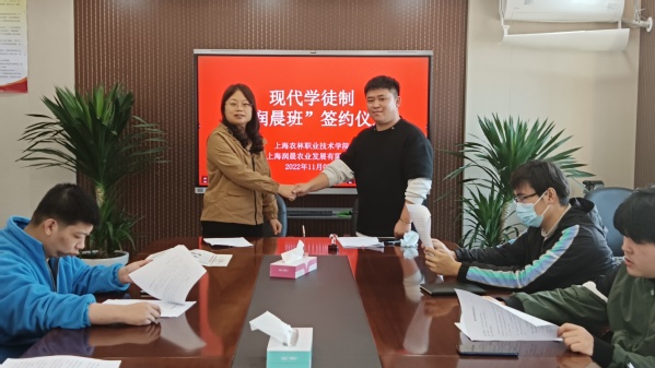 11月8日下午,在第二会议室,经济管理系现代学徒制“润晨班”签约仪式顺利举行,上海润晨农业发展有限公司(以下简称润晨农业公司)代表梅明川,经管系主任高萍、副主任路以兴、2021级辅导员及8名学生参加签约仪式。