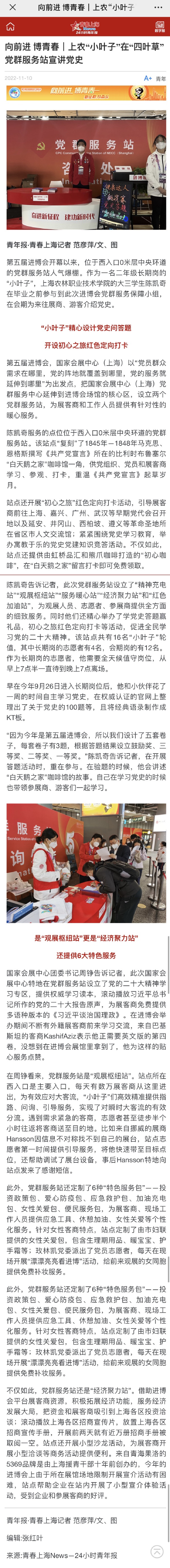第五届进博会开幕以来,位于西入口0米层中央环道的党群服务站人气爆棚。作为一名二年级长期岗的“小叶子”,上海农林职业技术学院的大三学生陈凯奇在毕业之前参与到此次进博会党群服务保障小组,在会期为来往展商、游客介绍党史。