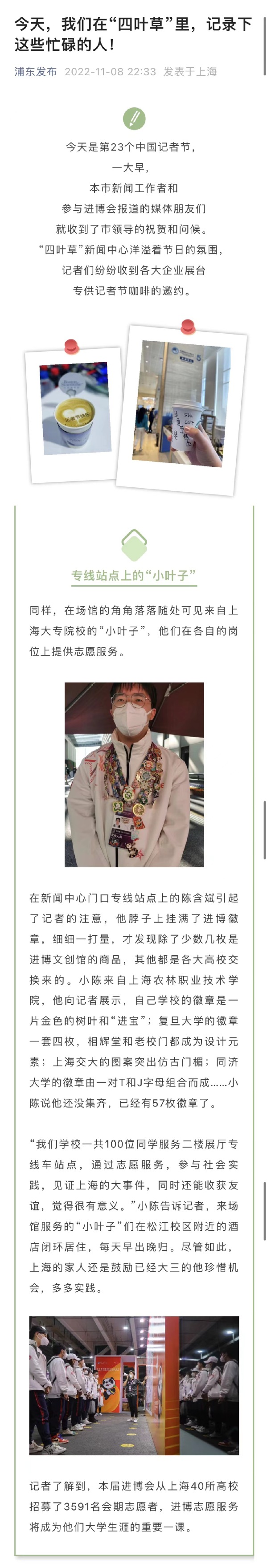 “我们学校一共100位同学服务二楼展厅专线车站点,通过志愿服务,参与社会实践,见证上海的大事件,同时还能收获友谊,觉得很有意义。”小陈告诉记者,来场馆服务的“小叶子”们在松江校区附近的酒店闭环居住,每天早出晚归。尽管如此,上海的家人还是鼓励已经大三的他珍惜机会,多多实践。