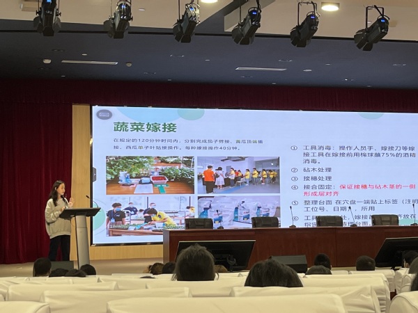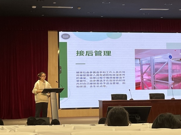 2021年、2022年连续两年获奖的园艺(中高贯通)192班袁一扬从参赛选手的角度介绍了蔬菜嫁接赛项,从蔬菜生产理论测试、砧穗识别、营养液配制、嫁接操作、接后管理及成活率检查等六个方面作了详细讲解,并讲述了一张张比赛现场照片背后的故事和细节,给了学弟学妹在赛场身临其境的感觉。2019年、2020年连续两年获奖倪思忆分享了在校4年来参加比赛和协助指导比赛的心路历程,她说:“不去尝试,怎会知道自己的潜力;用心训练,国赛并非遥不可及。”