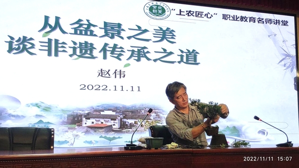 为切实将工匠精神、劳动教育与传统文化有机结合,增强学生对工匠精神内涵的深入理解和对海派盆景艺术的了解,11月11日下午,园林系邀请上海植物园国际盆景大师、海派盆景非遗传承人,现任园林系植物造型工作室带头人赵伟作主题为“从盆景之美谈非遗传承之道”的讲座,讲座以线上线下同步直播的形式进行,园林系师生共400余人参加。园林系主任刘秀云主持讲座。