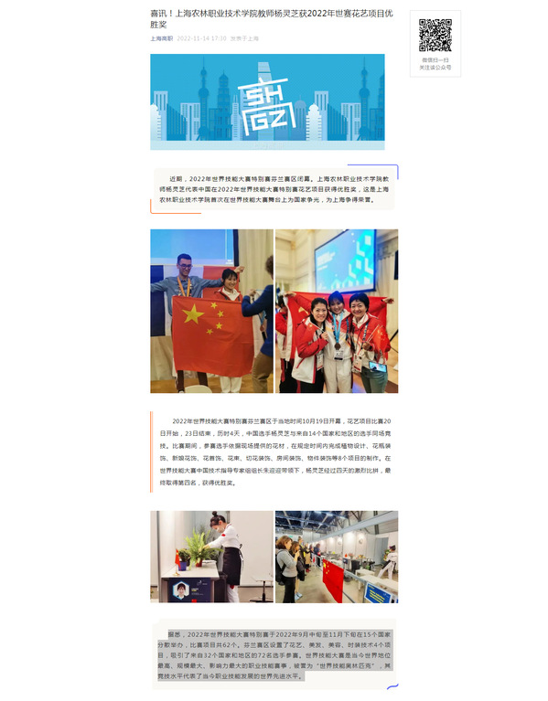 11月14日,“上海高职”公众号报道了世界技能大赛中国选手杨灵芝代表中国在2022年世界技能大赛特别赛花艺项目获得优胜奖。