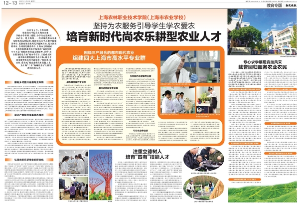 近年来,上海农林职业技术学院(上海市农业学校)将坚持价值塑造、知识传授、能力培养三者有机融合,坚持专业教育、素质教育、合作教育三者相互协同,落实立德树人根本任务,强化德技并修。学院的“十四五”发展规划把立德树人的成效作为检验一切工作的根本标准,构建具有农林特色的德智体美劳育人体系,下大力气培养学生具有爱国情怀、社会责任感、创新精神和实践能力。学院以专业建设为龙头,以强农兴农为己任,紧密服务上海乡村振兴战略,不断培育有初心、有农心、有匠心、有匠才的“四有”高素质、复合型技术技能人才。