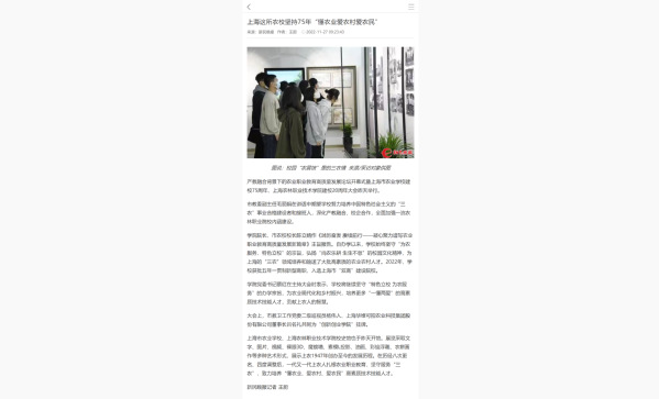 11月27日,新民晚报报道学校始终坚守“特色立校 为农服务”办学宗旨,75年矢志不渝为“三农”培养“懂农业、爱农村、爱农民”的高素质技术技能人才。