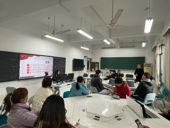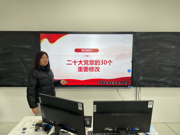 党总支书记袁少英介绍了学习新修订《中国共产党章程》的重要性和必要性,基础部教师党支部书记辛琳和思政课教师党支部书记马伟分别从“为什么要修改党章”“总纲部分的修改”“条文部分的修改”三个主题,向两个支部党员重点介绍了新修订《中国共产党章程》的要点。