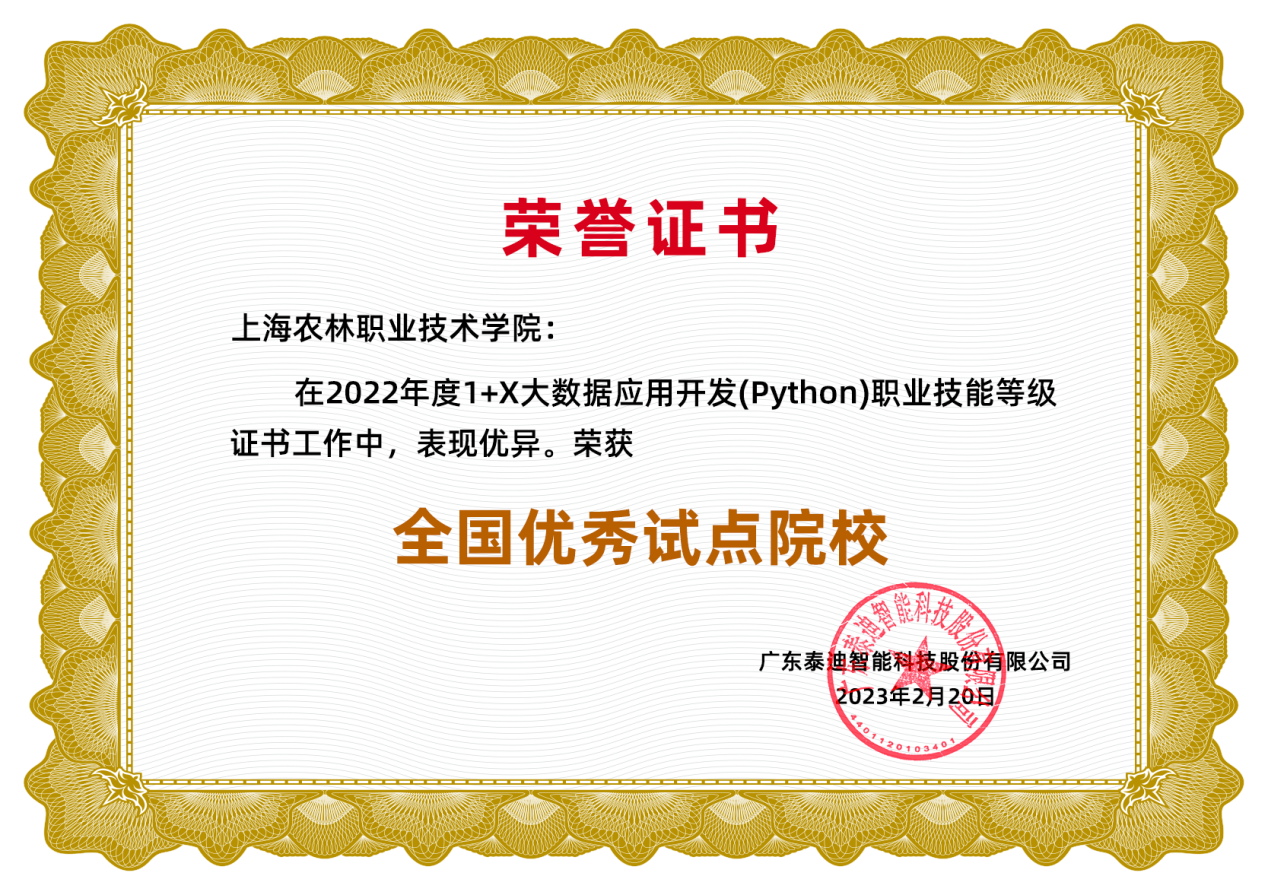 近日,教育部第四批“1+X”职业等级证书发布表彰相关文件,学院获1+X大数据应用开发(Python)职业技能等级证书项目全国优秀试点院校称号。