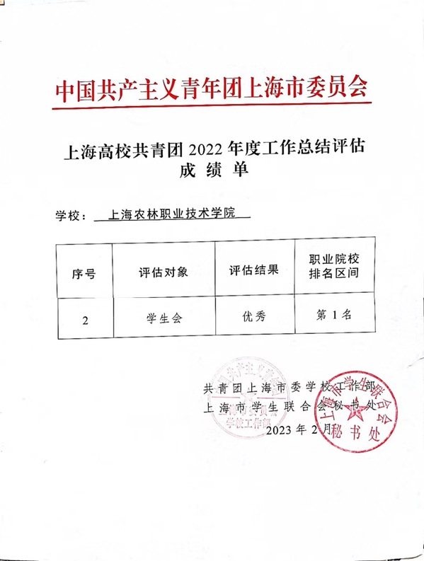 近日,共青团上海市委员会学校工作部、上海市学生联合会秘书处公布了2022年度上海高校共青团工作总结评估成绩单,学院学生会考核成绩为“优秀”,排名区间为全市高职第一,这是学院学生会第5年获得优秀。
