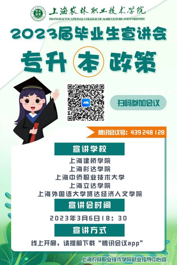 近年来,学院专升本报考人数连年增长,学生通过率不断提高。为进一步做好相关工作,切实提高学生升本率,3月6日晚,招就办在线上召开2023届毕业生专升本宣讲会,邀请了上海建桥学院、上海杉达学院、上海中侨职业技术大学、上海立达学院、上海外国语大学贤达经济人文学院五所院校的招办老师进行宣讲,200余名学生参加。招就办主任陆昭君主持宣讲会。