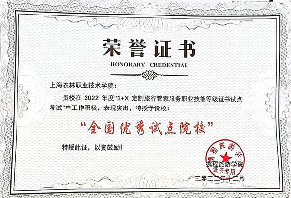 2022年,学院在“1+X定制旅行管家服务职业技能等级证书试点考试”中工作积极,表现突出,获“全国优秀试点院校”称号。