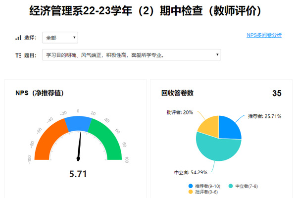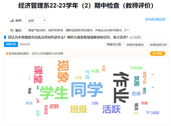 为做好本次教学质量诊改工作,经管系提前两周在问卷星平台编辑2022-2023学年(2)期中检查调查问卷,包括“教师评价问卷”和“学生评价问卷”,收到“教师评价问卷”35份、“学生评价问卷”1787份,各问卷分析结果为本次教学质量诊改工作奠定了基础。下一步,系部还将召开教学质量诊断与改进教师座谈会,把“学生评价问卷”的结果反馈给教师。