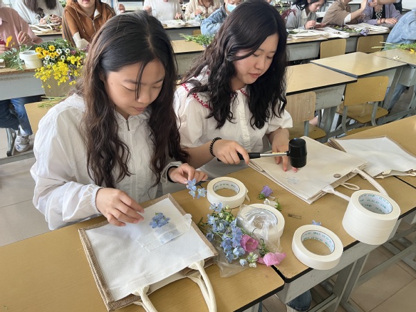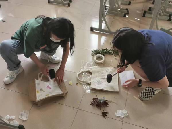 活动开始前,主持人向参与同学简单介绍了拓染步骤和注意事项。随后,同学们以小组形式开始制作。有的同学思如泉涌,制作的非常快;有的同学静静思考,小心翼翼不出一丝纰漏;也有的同学选料、制定方案、种植装饰,搭配各类植物颜色,随后用橡胶锤用力敲打出形,留住花叶原有的颜色纹路和形状。运用现有植物素材,在帆布包上结合各自理念,用心设计图案,每一种植物都有独特的姿态和色彩,即使同科、属、种类的植物根、茎、叶、花所拓染图案均不相同,同一植物的同一器官所产生的脉络纹理也不尽相同。
