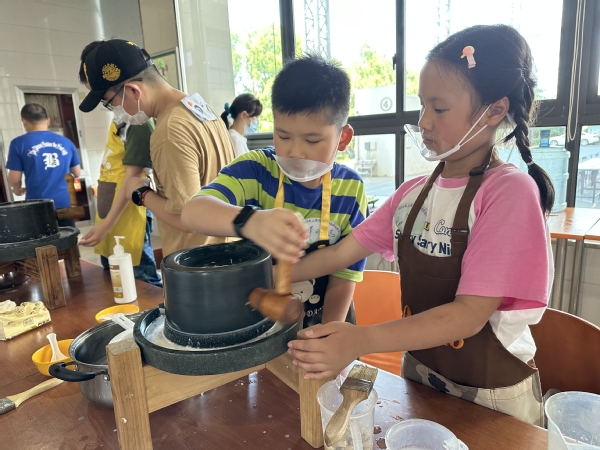 神奇的大豆项目,在师带的带领下,同学了解了大豆的起源及营养价值。在认真学习后,用传统的石磨将豆子研磨成豆浆,并加热制作成美味的豆腐脑。同学们说,品尝自己的劳动成果,体验过程既美味又美好。