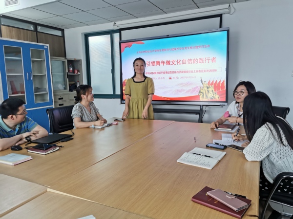 与会成员结合学习内容和工作实际展开交流。范小雪说:“习近平总书记对中华文化传承发展作了系统深入阐述,全面深刻地总结了中华文明的五个突出特性。作为教育工作者,我们要以习近平总书记的重要讲话精神为指引,在学深悟透、融会贯通的基础上引领青年大学生做文化自信的践行者,为建设文化强国而努力。”高晓翠说:“文化自信教育是高校思想政治教育的重要工作内容,作为学生工作者,要将文化自信教育融入到校园活动中,丰富内容、创新形式,引导大学生成为文化自信的传承者、弘扬者。”齐雪飞说:“身为系部团总支书记,我肩负着青年思想引领的责任,加强青年学生文化自信,要与具体的学生实践活动相结合,比如定期开展汉文化宣传周、书法比赛、古诗词大赛等,以学生喜闻乐见的形式开展传统文化宣传活动,赋予传统文化新时代的内涵,增长学生文化自信,推动文化传承。”