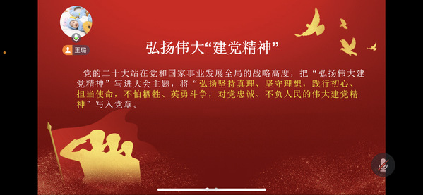王璐讲到,党的二十大站在党和国家事业发展全局的战略高度,把“弘扬伟大建党精神”写进大会主题,将“弘扬坚持真理、坚守理想,践行初心、担当使命,不怕牺牲、英勇斗争,对党忠诚、不负人民的伟大建党精神”写入党章。新征程上,我们要弘扬伟大建党精神,大力弘扬以伟大建党精神为源头的中国共产党人精神谱系。要从伟大建党精神中汲取真理力量,以信仰之光照亮新征程。要从伟大建党精神中汲取实践力量,以顽强斗争奋进新征程。要从伟大建党精神中汲取人格力量,以赤子之心投身新征程。要从伟大建党精神中汲取智慧力量,以历史主动走好新征程。