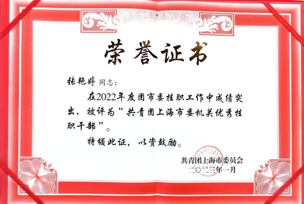 选派高校基层优秀团青干部赴团市委挂职是深入贯彻落实习近平总书记关于青年工作的重要思想和中央党的群团工作会议精神,进一步加强团干部队伍建设和优秀团青干部培养的重要方式。2022年7月,张艳婷赴团市委,先后在团结联络部(市青联秘书处)和市青少年服务和权益保护办公室2个部门挂职,个人政治素养、思维方式、知识积累、能力提高等方面得到显著提高。挂职期间,认真履职,协助部门开展市政协第十四届团青界别委员换届组织工作、上海青联学习党的二十大精神座谈会、全国维护青少年权益岗创建等活动,积极参与筹办上海市第十六次团代会,充分展现了农林青年教师的风采,工作成绩得到挂职单位充分认可。荣获“2022年度共青团上海市委机关优秀挂职干部”荣誉。