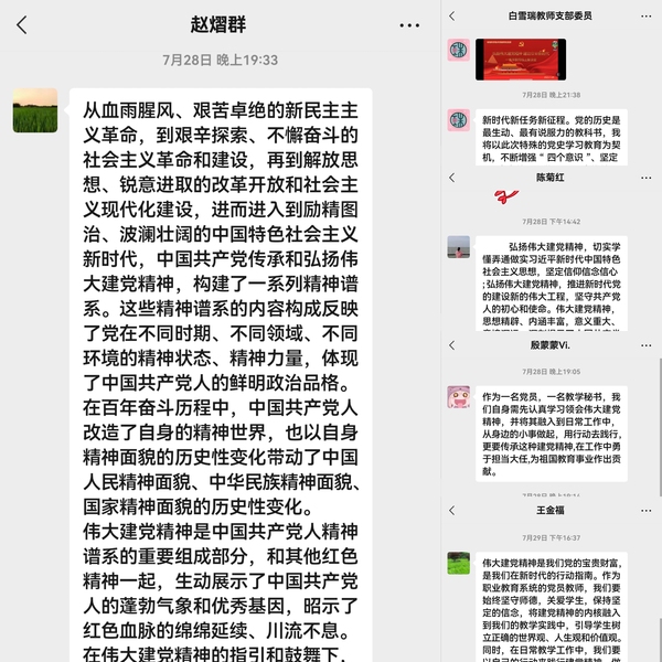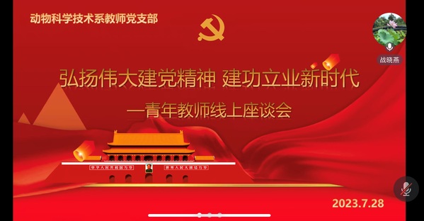 为深入学习贯彻习近平新时代中国特色社会主义思想主题教育,进一步强化党员身份意识、宗旨意识、责任意识,7月28日晚,动科系教师党支部开展“弘扬伟大建党精神 建功立业新时代” 主题党日活动暨青年教师线上座谈会,教师支部全体党员参加。活动由教师党支部书记战晓燕主持。