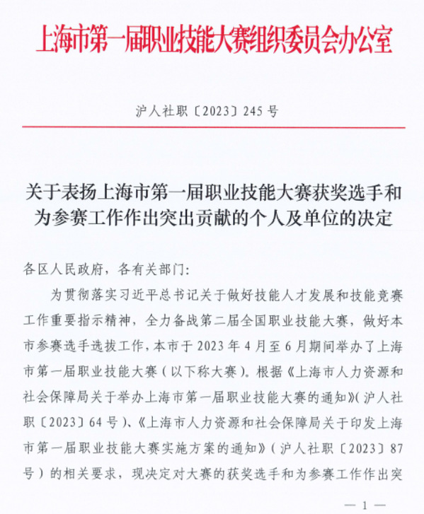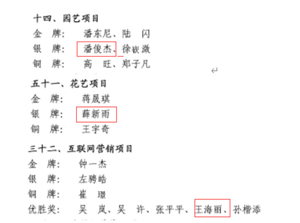 8月2日,上海市第一届职业技能大赛组织委员会办公室公布了《关于表扬上海市第一届职业技能大赛获奖选手和为参赛工作作出突出贡献的个人及单位的决定》(沪人社职〔2023〕245号),植科系潘俊杰、薛新雨两位学生分别荣获世赛项目——园艺、花艺项目银奖,创意系王海丽老师荣获国赛项目——互联网营销项目优胜奖。