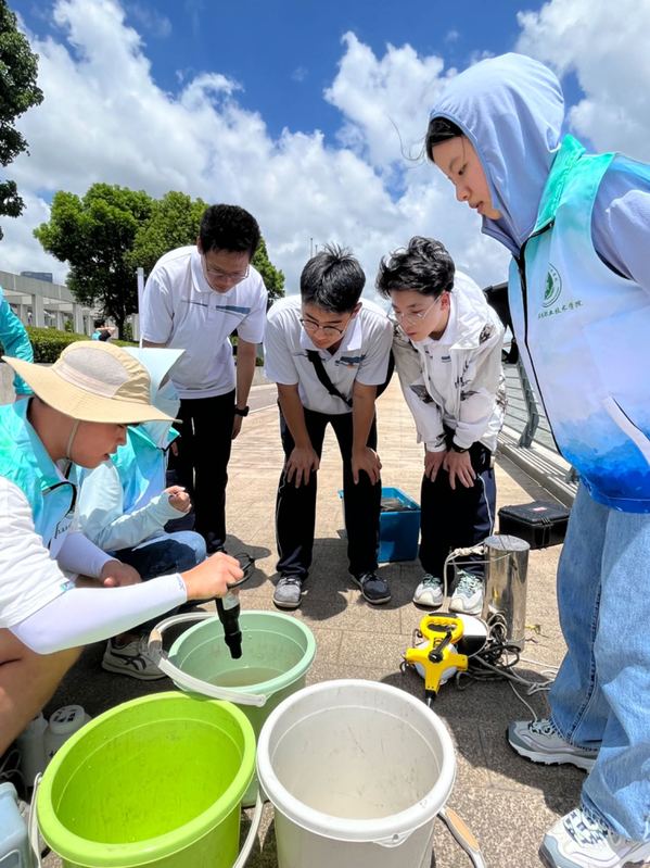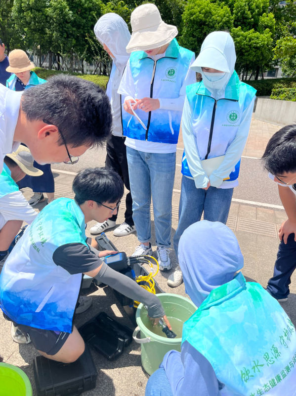 随后,团队成员在徐汇滨江采样点位进行水样采集。后续,两校学生将在指导老师的带领下完成自浦江之首至吴淞口多个国考断面的水样采集并检测叶绿素a、水深、水体流速、水温、酸碱度、溶氧、电导率、溶解固体物、总氮、总磷、硝酸盐和氨氮等理化指标以及藻类、浮游动物、底栖动物、水生植物等生物指标。同时对黄浦江及其支流进行历史文脉传承调研,创作调研日记、作品集、调研报告等实践成果,深入了解黄浦江松江区域内生态现状,深刻理解和落实生态文明理念,助力水生态文明建设。