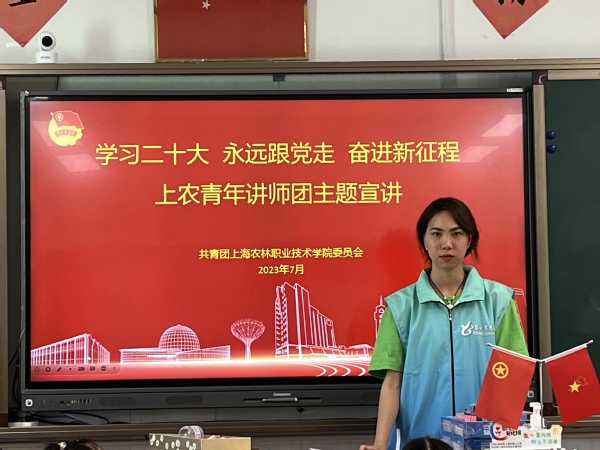 上农青年讲师团成员蒋君勤带来《学习二十大 永远跟党走》主题宣讲。她从党的二十大报告中关于“爱国主义”的重要论述切入,聚焦“爱党”“爱国”两大关键词,深入浅出地阐述爱党与爱国密不可分的关系。现场还通过观看红色影片、知识竞答等形式增强宣讲的感染力和吸引力,向学员们阐述了学习习近平新时代中国特色社会主义思想、深入贯彻党的二十大精神意义,帮助学员们加深了对党的二十大精神的理解和认识。