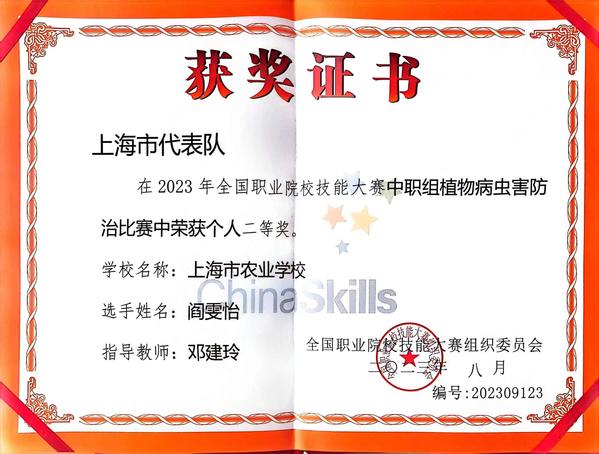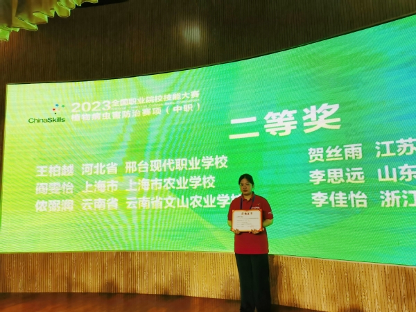 8月21日-24日,2023年全国职业院校技能大赛(中职组)“植物病虫害防治”赛项在山东省济南市济阳区职业中等专业学校举行。来自全国31个省(自治区、直辖市)的62支代表队同台竞技。经过激烈角逐,植科系园艺(中高贯通)212班的阎雯怡同学荣获二等奖。