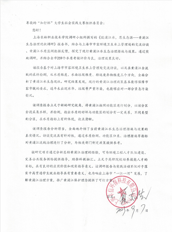 整个实践跨越徐汇区-黄浦区-杨浦区-宝山区-闵行区-松江区,几乎穿越整个上海市,过程是艰辛的,结果是满意的。形成了2万余字的《饮浦江水,思生态源---黄浦江生态治理现状调研》调研报告,获得了华东师范大学生态与环境学院研究员、博士生导师武冬以及主营环境保护产品开发与应用环境的国家高新技术企业上海丰信环保科技有限公司的总经理夏志先的高度肯定并为项目提供推荐函,同时受到中国网等主流媒体的广泛关注,进行新闻媒体报道1篇。