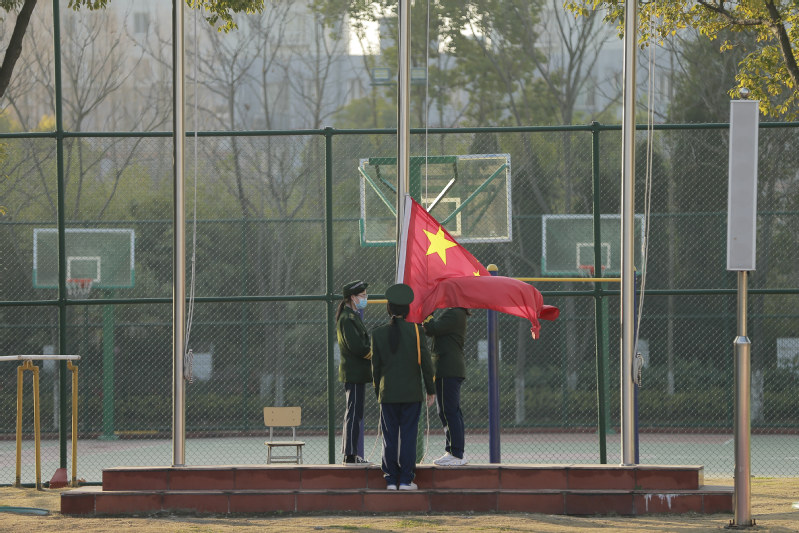 上午7:40,升国旗仪式正式开始,伴随着庄严的国歌声,五星红旗随着激昂的国歌声冉冉升起,全体师生肃立,行注目礼。