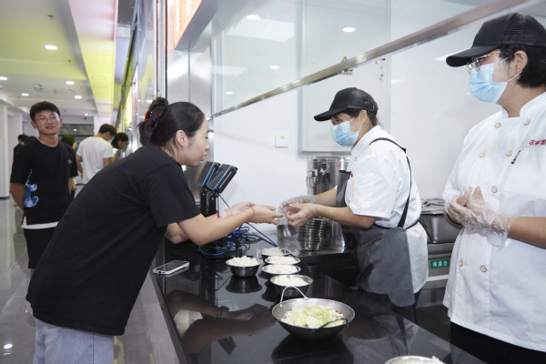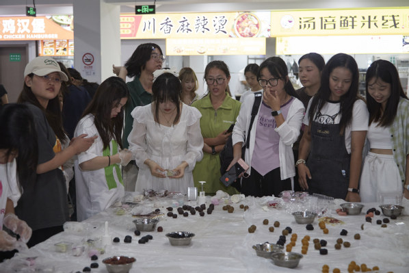 活动现场,同学们分组行动,互相传递着制作月饼所需的材料和工具。大家带着笑容和热情,认真揉搓面团、包馅料,压模最后成为五颜六色的冰皮月饼。并将亲手制作的月饼送给食堂工作人员、宿管以及门卫保安,向他们表达谢意。