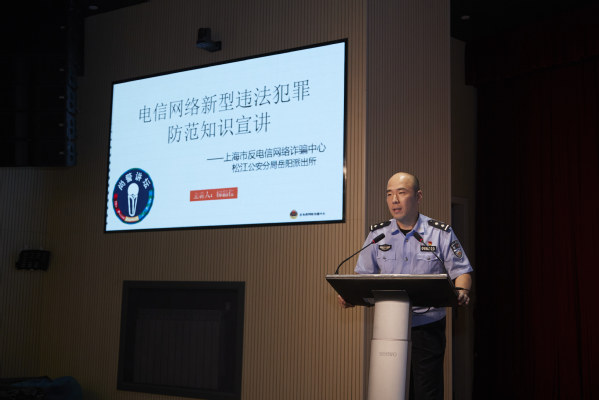 松江公安分局岳阳派出所柳警官以“电信网络新型违法犯罪防范知识宣讲”为主题,从电信诈骗的概念出发,详细介绍了电信诈骗犯罪目标广、手段翻新快、形式集团化、跨国跨境犯罪突出等特点,并列举了刷单诈骗、冒充购物网站客服、冒充“公、检、法”工作人员行骗、网络贷款诈骗等常见的诈骗手段。关于如何防范电信诈骗,柳警官告诫同学要抵制超出自我能力的物质、精神层面的诱惑,拒绝向陌生人转租转售身份证、银行卡、电话卡等,不随意点击网络链接,切实增强自我防护意识,从源头上防止上当受骗。