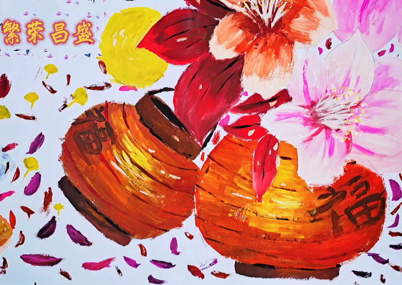 活动中,生药系学子用画笔绘制对祖国的崇敬与热爱。五彩的盛世龙腾、鲜艳的五星红旗、盛开的鲜艳花朵,一涂一画皆是对祖国真挚的情感。